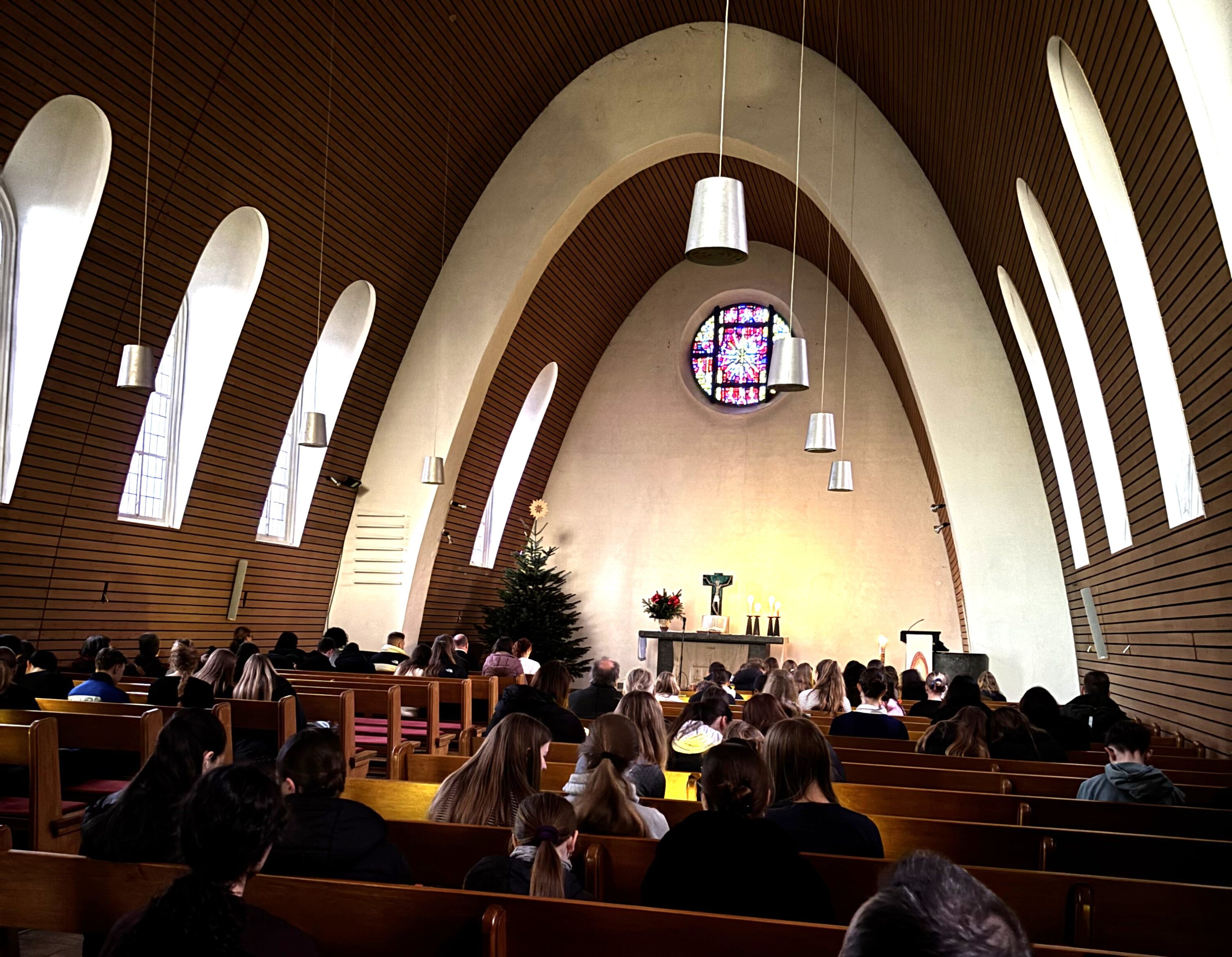 Den Abschluss vor den Ferien bildete als Tagesauftakt der Weihnachtsgottesdienst in der St. Johannes-Kirche, der in diesem Jahr vom Religionskurs des 7. Jahrgangs gestaltet und vom ehrenamtlichen Lektor Dieter Losemann geistlich begleitet wurde. Unter dem Motto „Warum feiern wir Weihnachten?“ wurde in Predigt und Rollenspiel dem Sinn des Festes nachgegangen. Spätestens beim gemeinsamen Singen von „O du fröhliche“ wurden die Besucher:innen in Weihnachtsstimmung versetzt.
