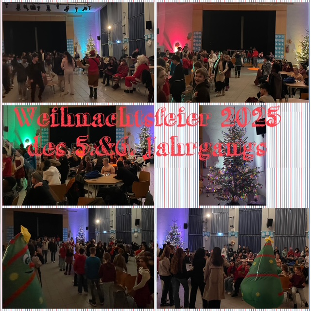 Am 15.12.25 feierten viele fröhliche weihnachtlich oder sehr kreativ verkleidete Schülerinnen und Schüler des 5. und 6. Jahrgangs bei unserer alljährlichen Weihnachtsfeier. So viele Wichtel hatte die Schule noch nie gesehen! Es wurde getanzt gespielt und die schönsten Verkleidungen wurden von den Paten des 10. Jahrgangs gewählt und mit einem kleinen Preis belohnt. Ein Wichtelpaar und Spider Man haben die Siege geholt. Der Nachmittag war sehr gelungen, denn selbst der Weihnachtsmann und ein Weihnachtsbaum tanzten zur Musik. Eigentlich war das Ende um 18:00 viel zu früh, denn die Feiernden hatten noch viel Energie.